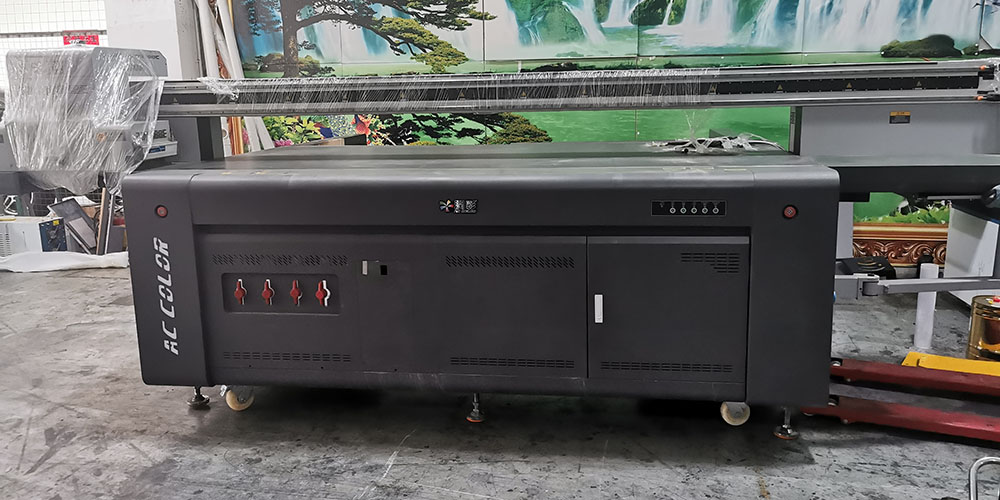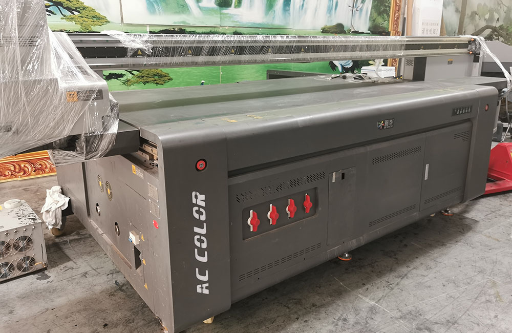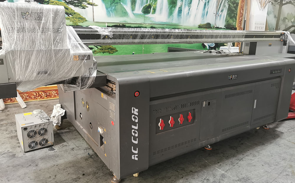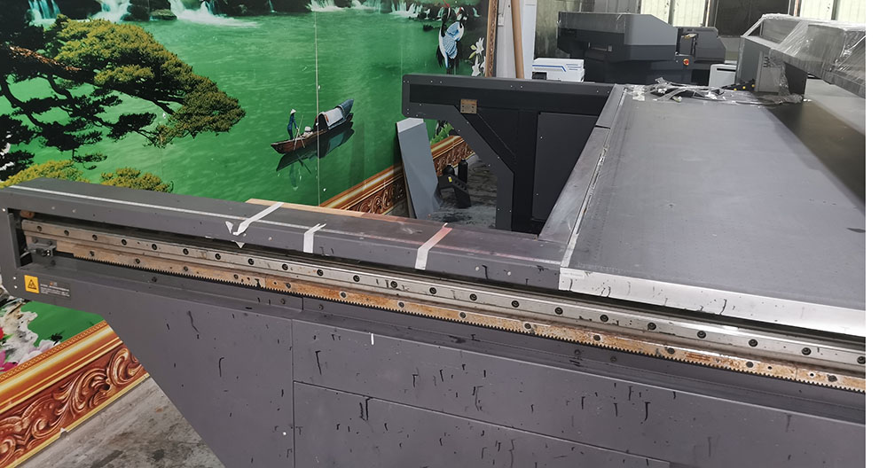 这台多功能UV打印机刚刚到工厂不到一天时间,保鲜膜都还没有拆下来,平面产品可以打印3x1.3米,侧面产品可以打印3x1.1米,非常合适打印比如门板以及需要侧面打印的产品。